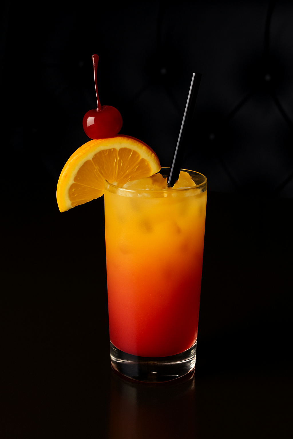 White Rum, Pineapple Juice, Orange Juice, Grenadine, Dark Rum, Orange & Cherry Garnish