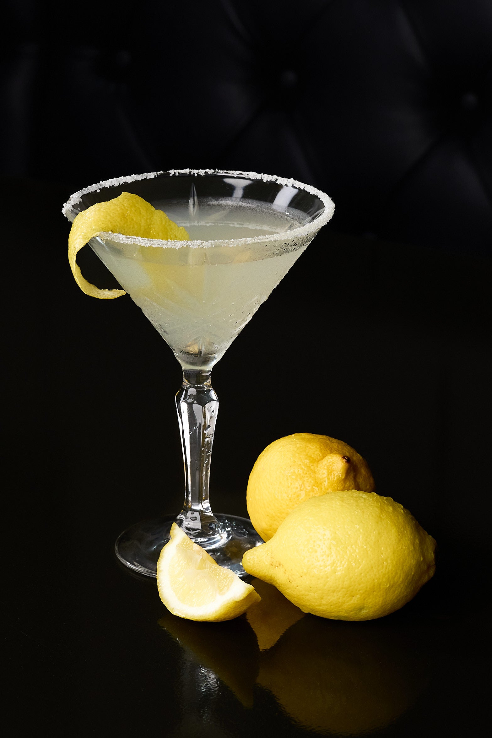 Citrus Vodka, Triple Sec, Simple Syrup, Lemon Juice, Sugar Rim, & a Lemon Garnish