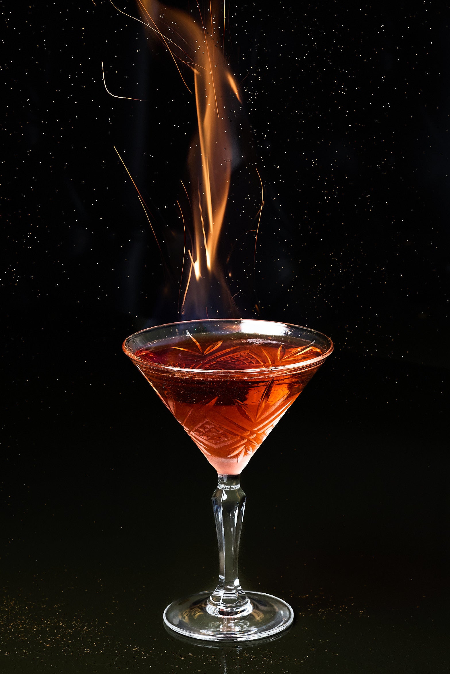 Cherry Vodka, Stirrings Pomegranate, Lime Juice, Simple Syrup, and a Cinnamon Fire Garnish